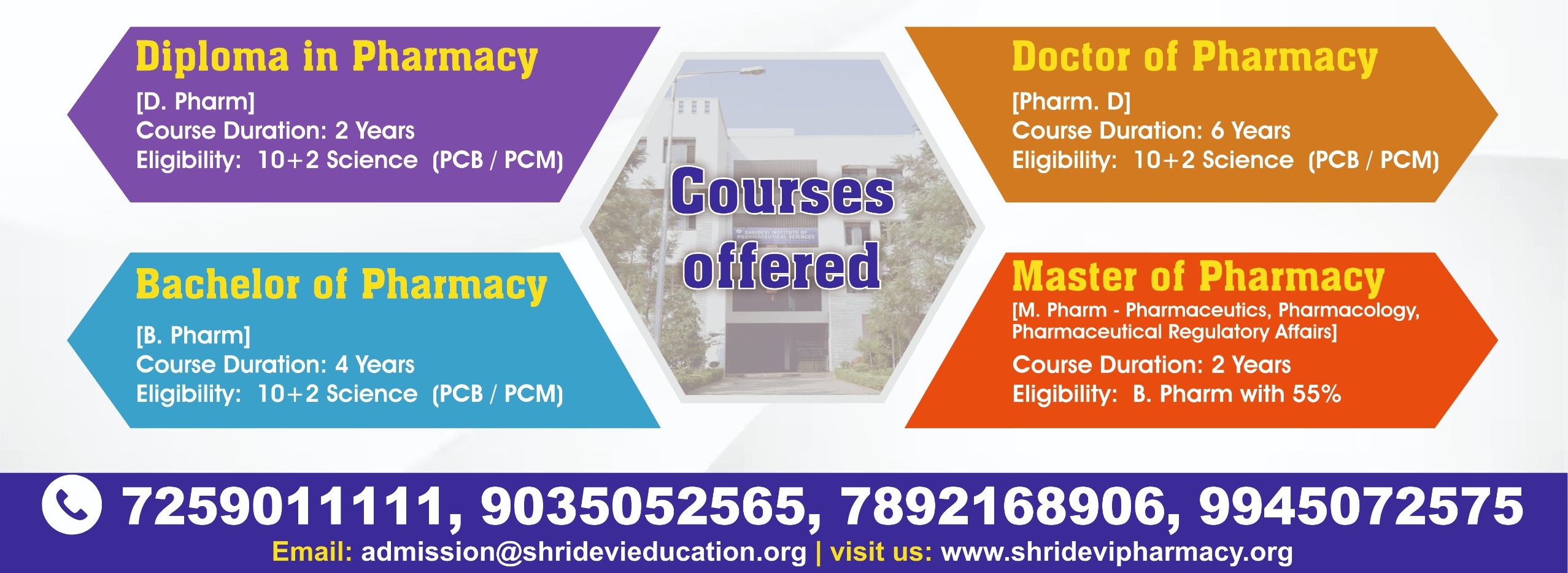 Shridevi institute of pharmaceutical sciences was established in the year 2019 and is involved in imparting quality education. All courses in Pharmacy are approved by Pharmacy Council of India, affiliated to Rajiv Gandhi University of Health Sciences, Karnataka.